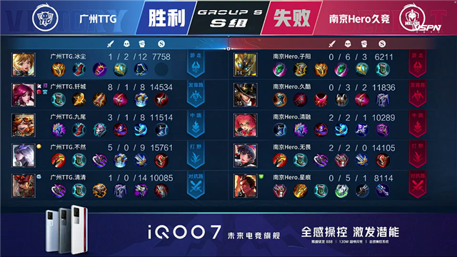 开局49秒广州TTG太乙真人击杀孙膑拿下一血,1分17秒中路团战广州TTG打出1换3。2分16秒南京Hero拿下暴君,广州TTG拿下先知主宰。4分钟南京Hero击杀不知火舞,6分55秒广州TTG拆掉南京Hero上路一塔。7分55秒南京Hero拆掉广州TTG中路一塔,10分22秒中路团广州TTG击杀猪八戒。10分51秒广州TTG拿下暗影暴君,12分31秒广州TTG击杀猪八戒。14分29秒上路团广州TTG打出0换3,虞姬拿下三杀,15分钟广州TTG拆掉南京Hero上路高地。17分32秒广州TTG拿下暗影主宰,19分30秒广州TTG拿下暗影暴君。21分05秒团战广州TTG打出3换4,21分43秒广州TTG拆掉南京Hero中路高地,一波摧毁南京Hero水晶。
