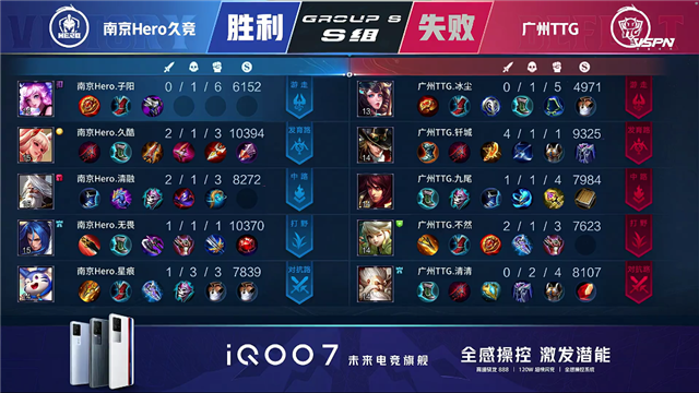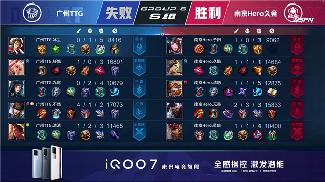 广州TTG三Buff开局,2分45秒广州TTG拿下先知主宰。4分12秒团战双方1换1,广州TTG拿下暴君。5分20秒团战双方1换1,5分38秒广州TTG击杀太乙真人。6分30秒团战双方1换1,8分钟广州TTG拆掉南京Hero上路二塔,8分39秒广州TTG拿下暴君。10分20秒广州TTG拿下暗影主宰,10分30秒中路团双方1换1,12分03团战双方2换2。12分47秒团战广州TTG打出0换3,拆掉南京Hero下路高地。13分钟广州TTG拆掉南京Hero中路高地,打出0换2一波团灭南京Hero,一波拆掉水晶拿下胜利。