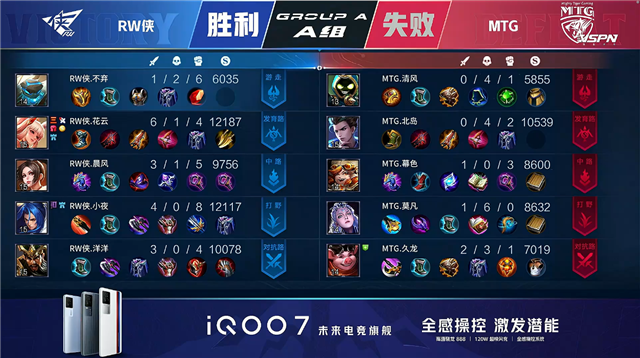 双方常规开局,1分12秒MTG拿下中路河道之灵。2分15秒RW侠击杀娜可露露拿到一血并拿下暴君。3分23秒RW侠中路击杀王昭君。5分35秒中路团战RW侠打出0换3。6分11秒野区团战RW侠击杀娜可露露。7分27秒RW侠摧毁敌方上路二塔。7分49秒RW侠拿下暴君。7分58秒MTG拿下主宰。8分20秒RW侠中路击杀王昭君。8分33秒RW侠摧毁敌方西路二塔。8分42秒RW侠打出0换2并摧毁敌方下路高地塔。9分10秒RW侠摧毁敌方水晶拿下比赛。