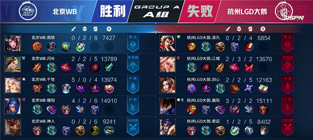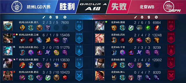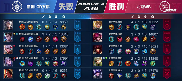 1分钟中路下河道交火,不知火舞拿下一血。1分32秒项羽推掉上路一塔。3分10秒杭州LGD大鹅拿下暴君。4分45秒双方互换边路一塔。5分23秒杭州LGD大鹅推掉上路二塔。5分40秒杭州LGD大鹅拿下主宰。6分35秒公孙离单杀橘右京。7分35秒澜拿下暴君。8分55秒杭州LGD大鹅推掉中路一塔。10分17秒澜拿下暴君。11分50秒杭州LGD大鹅强攻中路二塔,澜拿下双杀。12分15秒公孙离推掉下路高地塔。12分23秒杭州LGD大鹅强推中路高地塔,嫦娥拿下双杀。13分05秒橘右京拿下主宰。15分钟廉颇在野区被击杀。15分40秒暴君团,北京WB打出2换4。16分钟橘右京拿下暴君。16分10秒北京WB推掉中路一塔。17分20秒虞姬推掉下路二塔。18分05秒澜被击杀。18分40秒北京WB推掉下路高地塔,团战北京WB打出1换2。18分52秒北京WB攻破水晶追回一分。