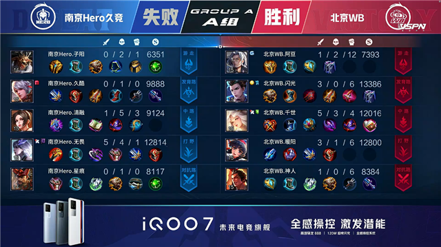 开局南京Hero选择野区入侵未果。1分11秒南京Hero拿下中路河道之灵。2分44秒中路团战南京Hero击杀嫦娥拿到一血。3分27秒北京WB中路击杀不知火舞。3分56秒南京Hero镜中路单杀嫦娥。6分27秒暴君处团战双方1换1。6分50秒南京Hero拿下暴君。6分57秒北京WB拿下主宰。8分13秒野区双方1换1。9分29秒北京WB摧毁敌方中路外塔。10分03秒北京WB下路击杀镜。10分37秒北京WB暴君处击杀牛魔并拿下暗影暴君。11分15秒北京WB上路击杀百里守约。11分43秒北京WB摧毁敌方中路二塔。12分27秒野区北京WB打出1换2。12分58秒北京WB拿下暗影主宰。14分30秒北京WB上路击杀不知火舞。14分54秒北京WB摧毁敌方上路高地塔。15分11秒北京WB摧毁敌方中路外塔。15分28秒北京WB拿下暗影暴君。16分23秒下路团战北京WB打出0换4。16分55秒北京WB摧毁敌方水晶拿下比赛。