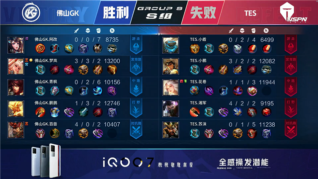开局TES狄仁杰抢中线。47秒佛山GK反掉红BUFF并反掉红隼。1分59秒双方上路1换1,佛山GK拿到一血。2分08秒TES下路击杀瑶。5分15秒佛山GK拿下主宰,TES摧毁敌方下路外塔。5分48秒TES下路元歌单杀娜可露露。6分41秒TES拿下暴君。7分12秒佛山GK中路击杀娜可露露。7分51秒中路团战佛山GK打出0换2。9分03秒佛山GK中路击杀太乙真人。10分21秒TES拿下暗影主宰。12分28秒佛山GK摧毁敌方下路二塔。12分44秒佛山GK下路击杀太乙真人。13分48秒TES上路击杀娜可露露。14分57秒佛山GK拿下暗影暴君。15分10秒佛山GK下路击杀露娜。15分38秒中路团战佛山GK打出0换3。15分56秒佛山GK摧毁敌方水晶拿下比赛。