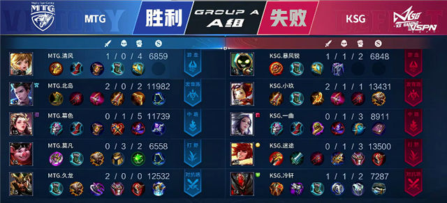 开局双方中路抢线,太乙真人拿下一血。2分20秒MTG拿下暴君,KSG拿下主宰。4分15秒KSG推掉上路一塔。5分10秒MTG推掉下路一塔。6分钟上河道团战,猪八戒被击杀。6分50秒杨玉环拿下暴君。7分15秒中路团战,猪八戒被击杀。8分45秒狄仁杰推掉下路二塔。9分30秒双方互换边路一塔。9分40秒MTG推掉上路二塔。11分27秒猪八戒拿下暴君。13分10秒MTG拿下暴君。14分45秒MTG推掉中路一塔。15分40秒MTG拿下暴君。16分35秒野区团战,MTG打出1换2。16分50秒MTG强攻中路二塔,团战打出0换2,MTG顺势进攻高地,关羽击杀甄姬。17分13秒MTG攻破水晶拿下本场比赛胜利。