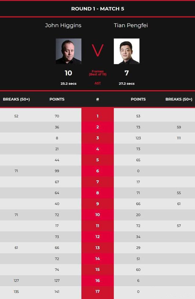 第13局,希金斯凭借单杆61分的不错表现以66:29拿下此局比赛的胜利从而以6-7落后田鹏飞。第14局,希金斯凭借多次上手的机会以72:51拿下这一局比赛的胜利从而以7-7战平田鹏飞将双方拉回同一起跑线。第15局,虽然田鹏飞拿到了60分,但是他太多的失误让希金斯成功把握到多次上手的机会并让对手拿到74分,最终希金斯以74:60拿下此局从而以8-7领先田鹏飞。第16局,希金斯终于打出了非常火热的竞技状态,他凭借单杆127分的绝佳表现以9-7领先田鹏飞率先拿到赛点。第17局,希金斯单杆直接轰出135分,从而以141:0零封田鹏飞确定10-7击败中国名将田鹏飞成功闯进第二轮。