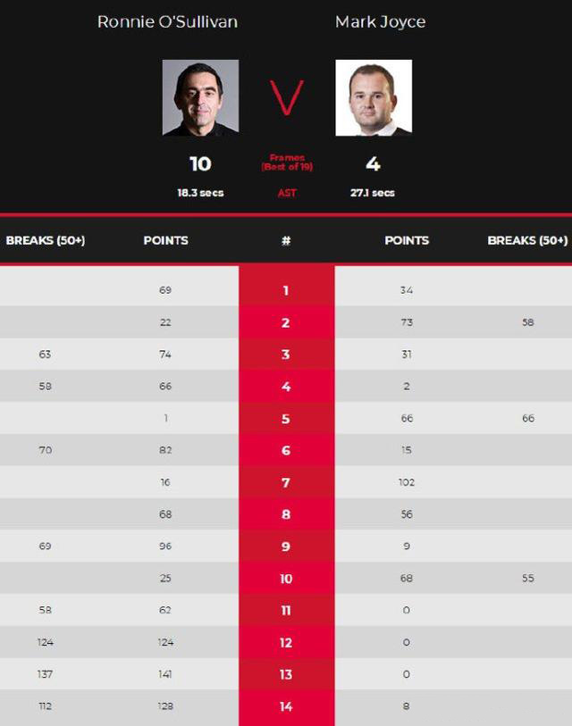 第10局,乔伊斯打出不俗的状态,他凭借单杆55分的表现68:25拿下此局比赛的胜利从而以4-6落后奥沙利文将双方的局分差拉回到两局。第11局,奥沙利文单杆轰出58分的不错表现确定以62:0零封对手确定以7-4领先乔伊斯。第12局,奥沙利文终于打出非常火热的手感,他在打进红球之后就不再给对手任何的上手机会,最终他凭借单杆124分的绝佳表现以124:0拿下此局比赛的胜利从而确定以8-4领先乔伊斯将领先优势扩大为四局。第13局,奥沙利文凭借单杆137分破百的绝佳表现141:0拿下此局比赛的胜利从而确定以9-4领先乔伊斯拿到赛点。