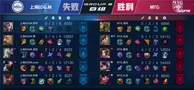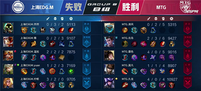 双方平稳开局。2分30秒赵云抢下暴君。4分10秒MTG拿下主宰。5分12秒赵云反下蓝buff。5分45秒狄仁杰推掉下路一塔。6分50秒赵云拿下暴君。7分40秒中路团战,上海EDG.M打出1换2,阿古朵拿下一血。9分50秒狄仁杰推掉上路一塔,鲁班七号推掉中路一塔。11分10秒上海EDG.M暴君逼团,MTG打出3换5,马超拿下双杀,阿古朵拿下暴君,MTG顺势推掉中路一塔。12分56秒MTG拿下主宰。13分10秒野区团战,MTG打出0换3,上官婉儿拿下双杀。13分31秒MTG推掉中路二塔并击杀沈梦溪。14分钟MTG攻破水晶率先拿下赛点。