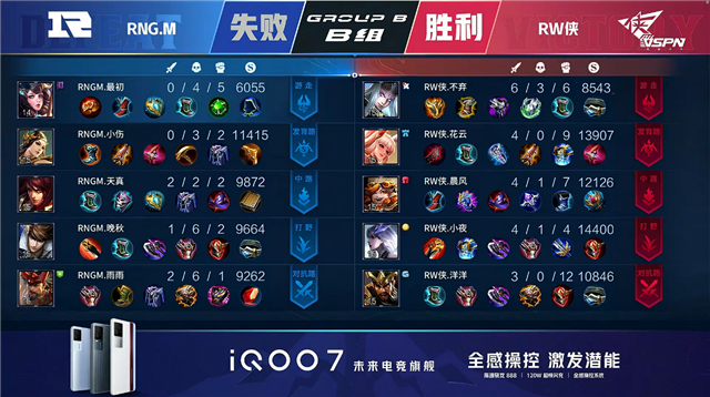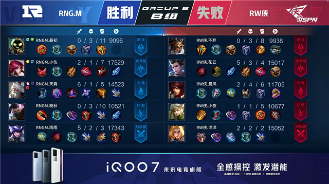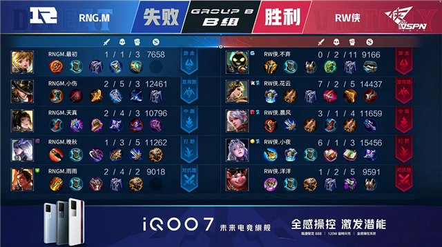 双方常规开局,1分04秒RW侠主宰处击杀姜子牙拿到一血。2分07秒RNG.M野区击杀周瑜。3分31秒RW侠野区击杀伽罗。4分05秒RW侠摧毁敌方下路外塔。4分39秒RW侠拿下暴君。5分28秒中路团战RW下打出1换2。7分06秒RNG.M主宰处击杀夏洛特。7分43秒RNG.M摧毁敌方上路外塔。7分52秒RNG.M摧毁敌方下路外塔。9分12秒RW侠拿下主宰。9分37秒RNG.M拿下暴君。10分27秒中路团战双方1换1。10分49秒RW侠拿下暗影暴君。11分53秒RW侠摧毁敌方上路二塔。12分06秒上路团战RW侠打出1换2。12分21秒RNG.M上路击杀周瑜。13分56秒暴君处团战RNG.M打出0换2。14分29秒RNG.M摧毁敌方中路二塔。14分39秒RNG.M摧毁敌方上路二塔。15分16秒RNG.M拿下暗影暴君。17分25秒RNG.M拿下暗影主宰。18分28秒RNG.M摧毁敌方下路高地塔。19分22秒RNG.M摧毁敌方中路高地塔。20分45秒RNG.M抢到风暴龙王,团战RNG.M打出3换5。21分27秒RNG.M摧毁敌方水晶拿下比赛。