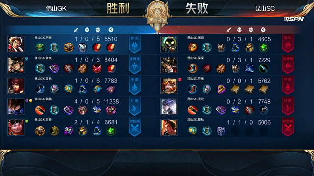 双方常规开局。1分50秒佛山GK下路打出0换2。2分02秒佛山GK摧毁敌方下路外塔。3分07秒上路团战佛山GK击杀太乙真人。4分52秒佛山GK中路下河道澜单杀敌方镜。5分06秒佛山GK摧毁敌方上路外塔。5分24秒佛山GK摧毁敌方上路二塔。5分38秒佛山GK中路打出1换2。6分03秒佛山GK摧毁敌方中路外塔。6分44秒佛山GK拿下主宰、暴君。7分28秒佛山GK摧毁敌方下路二塔。9分01秒佛山GK摧毁敌方中路二塔。9分33秒佛山GK摧毁敌方中路高地塔。10分09秒佛山GK拿下暗影暴君。10分42秒佛山GK拿下暗影主宰。12分整下路团战佛山GK打出0换3并摧毁敌方下路高地塔。12分26秒佛山GK摧毁敌方水晶拿下比赛。