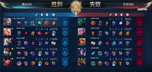 双方和平开局。2分14秒橘右京抢下暴君。3分20秒中路团战,公孙离拿下一血。4分15秒赵云拿下主宰。6分59秒赵云拿下暴君。8分30秒北京WB下路一塔被破。8分45秒关羽被击杀。9分10秒赵云推掉上路一塔。9分40秒猪八戒被击杀。11分30秒赵云拿下暴君。11分50秒关羽被击杀,北京WB上路二塔被破。15分40秒赵云拿下暴君。17分钟赵云拿下主宰。17分30秒猪八戒被击杀。19分30秒野区团战,佛山GK打出0换3。20分30秒公孙离拿下风暴龙王。21分35秒公孙离推掉中路高地塔。25分25秒关羽被击杀。25分55秒赵云拿下风暴龙王。26分钟高地团战,佛山GK打出0换3。26分43秒佛山GK推掉水晶拿下本场比赛胜利。