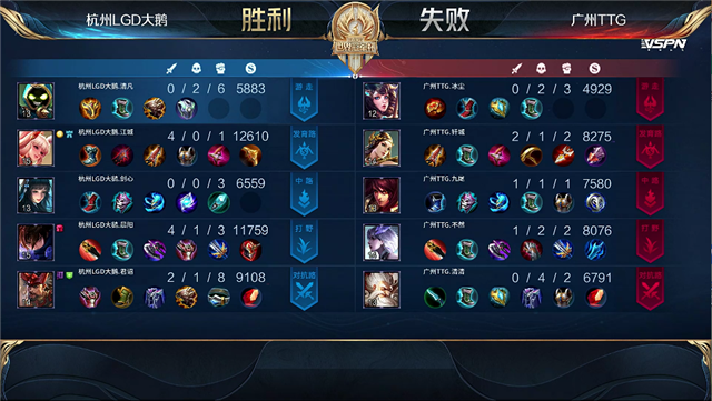 2分13秒,杭州LGD大鹅拿到暴君。3分29秒,广州TTG镜越塔击杀太乙真人拿下一血。5分13秒,杭州LGD大鹅上路塔下反打击杀老夫子。6分30秒,杭州LGD大鹅拿下暴君并打出0换2。8分44秒,野区团,双方1换1,杭州LGD大鹅破掉广州TTG中一塔。10分19秒,杭州LGD大鹅拿下暗影暴君。11分14秒,杭州LGD大鹅破掉广州TTG上二塔。12分15秒,杭州LGD大鹅上路击杀老夫子。12分34秒,杭州LGD大鹅团战打出1换3,随后破掉广州TTG中二塔及中高地。13分06 秒,杭州LGD大鹅再次击杀两人后摧毁广州TTG水晶。