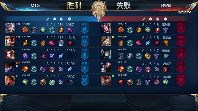 1分钟,MTG入侵蓝野区,RW侠反打打出1换2,大乔拿下双杀。2分32秒,RW侠拿下暴君并击杀澜。4分12秒,MTG拿下先知主宰。4分55秒,双方团战1换1。6分40秒,RW侠中路击杀鲁班七号,随后控下暴君。7分10秒,RW侠破掉MTG中一塔。7分58秒,双方团,MTG打出2换5团灭对手,澜拿下三杀。8分17秒,MTG下路越塔击杀兰陵王,随后破掉RW侠下二塔。8分43秒,MTG澜越高地击杀西施。9分31秒,MTG拿下先知主宰。10分13秒,MTG拿下暗影暴君。12分06秒,MTG控下暗影主宰。14分07秒,MTG破掉RW侠上二塔。14分35秒,MTG拿下暗影暴君。14分46秒,MTG鲁班七号击杀兰陵王。16分20秒,MTG拿下暗影主宰随后击杀廉颇。16分53秒,MTG破掉RW侠上高地,双方团战最终3换3。19分17秒,河道团,MTG打出2换5团灭对手。19分51秒,MTG下路一波摧毁RW侠水晶。