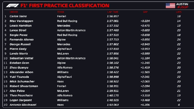 2022年F1美国大奖赛第1次练习赛成绩表: