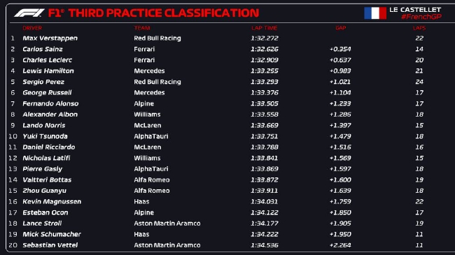 2022年F1法国大奖赛第3次练习赛成绩表: