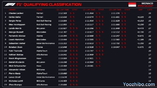 JRS直播网讯 2022年F1摩纳哥大奖赛排位赛在蒙特卡洛赛道结束,法拉利车队摩纳哥车手勒克莱尔凭借Q3第一个飞驰圈的完美表现,拿到摩纳哥的杆位!不仅完成赛季三连杆,也连续第二年在主场夺杆!他的队友塞恩斯第二,法拉利包揽头排,红牛车队佩雷兹第三。
