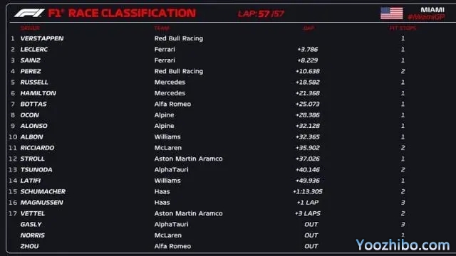 在红军与勒克莱尔放弃进攻下,维斯塔潘以3.786秒差夺下赛史首座迈阿密冠军并包下最快单圈1分积分,让他将与勒克莱尔间的差距拉近到一场大赛内,塞恩斯也摆脱佩雷兹的纠缠取得第三,摆脱前两场大赛决赛交白卷的低潮。