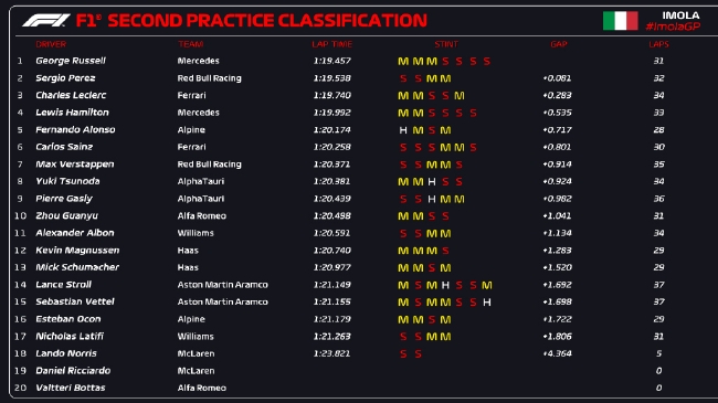 JRS直播网讯 2022年F1伊莫拉站第2次练习赛4月23日晚结束,车手们都在进行长距离测试,最终拉塞尔凭借1:19.457的单圈成绩位列第一,佩雷兹落后0.081秒位列第二,勒克莱尔第三。第四至第十分别是:汉密尔顿、阿隆索、塞恩斯、维斯塔潘、角田裕毅、加斯利、周冠宇。