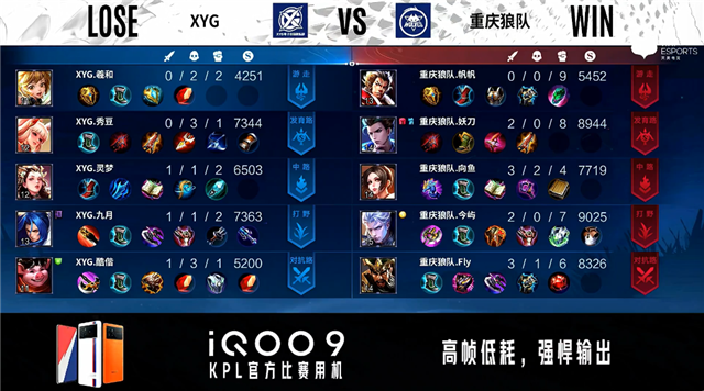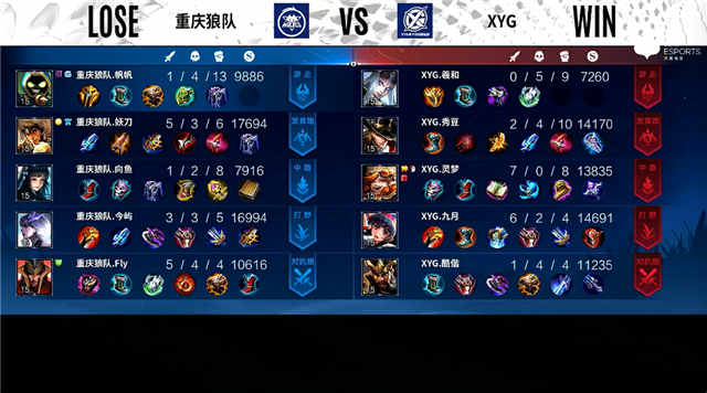 开局双方射手中路抢线。45秒XYG反掉敌方红BUFF。4分28秒重庆狼队中路下河道击杀猪八戒拿到一血。6分11秒暴君处团战重庆狼队打出1换2。7分44秒发育路团战重庆狼队打出1换5。8分15秒重庆狼队摧毁敌方中路二塔。9分45秒重庆狼队摧毁敌方发育路高地塔。10分16秒重庆狼队拿下暗影主宰。11分27秒重庆狼队摧毁敌方对抗路高地塔。11分42秒重庆狼队摧毁敌方中路高地塔。12分13秒重庆狼队摧毁敌方水晶拿下比赛。