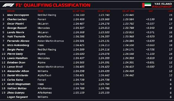 JRS直播网讯 2023年F1阿布扎比大奖赛排位赛结束,红牛车队维斯塔潘获得杆位,这是他职业生涯第32个杆位,也是本赛季第12个杆位,他与曼塞尔并列成为F1史上杆位次数第7的车手;法拉利车队勒克莱尔第二,迈凯伦车队皮亚斯特里第三。第四至十位的分别是:拉塞尔、诺里斯、角田裕毅、阿隆索、霍肯伯格、佩雷兹、加斯利。汉密尔顿第11,中国车手周冠宇第19。周日晚上21点正式比赛。