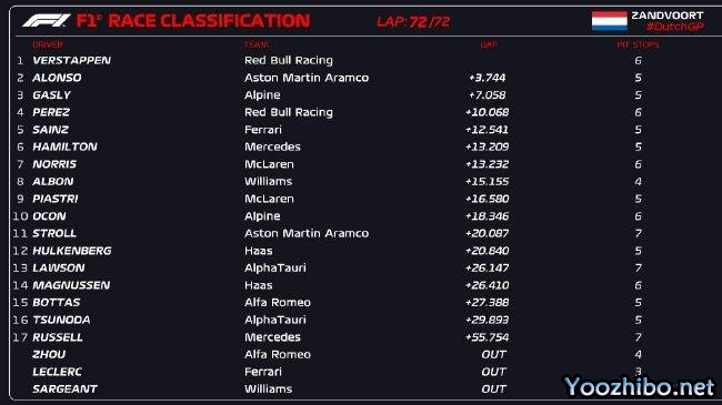 佩雷兹、塞恩斯、汉密尔顿、诺里斯、阿尔本、皮亚斯特里、奥康分列四至十位。中国车手周冠宇发车后一度占据第2的位置,但因为比赛下大雨划出赛道遗憾退赛,同样退赛的还有法拉利车队勒克莱尔。