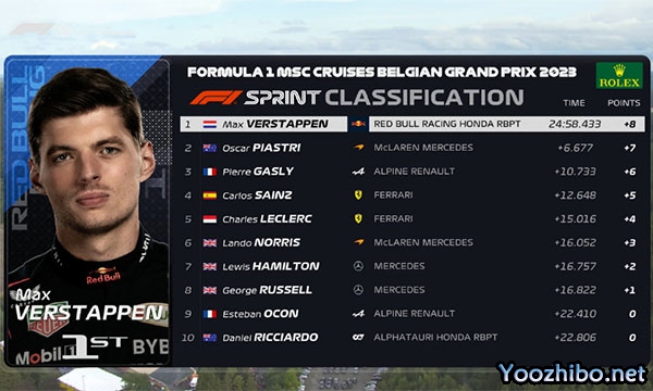 JRS直播网讯 2023年F1比利时大奖赛冲刺赛在斯帕赛道结束,红牛车队维斯塔潘在安全车结束后完成对皮亚斯特里的超越,顺利拿到冲刺赛第一,迈凯伦车队澳大利亚新秀皮亚斯特里取得第二名,Alpine车队加斯利上升三个位置,取得第三。