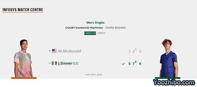 2022法网男单第3轮 麦克唐纳德vs辛纳 全场录像回放