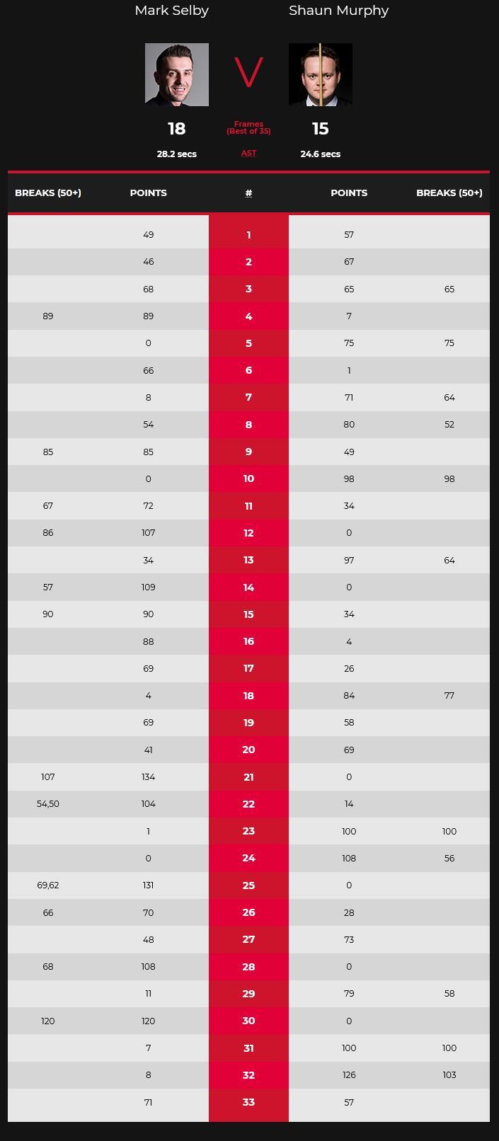 第22局塞尔比两次上手,打出单杆54分和50分再赢一局,第23局塞尔比只打进一颗红球就中断进攻,墨菲不甘示弱轰出单杆100分,第24局墨菲打出单杆56分108-0再赢一局,第25局塞尔比打出单杆62分转入防守,墨菲漏球,塞尔比打出单杆79分拿下这一局。