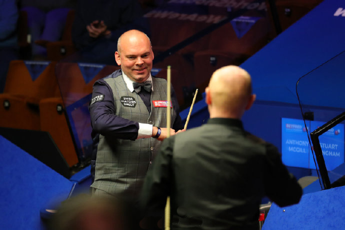 JRS直播网讯 北京时间4月29日凌晨,2021斯诺克世锦赛第三场四分之一决赛,宾汉姆在7-10落后的情况下,连胜五局12-10赛点,麦克吉尔12-12追平,比赛进入决胜局,宾汉姆单杆破百拿下比赛。