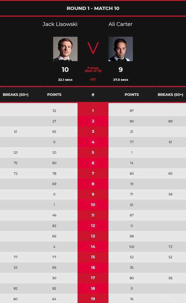 第17局,利索夫斯基率先上手,单杆10分后断掉。卡特上手,单杆拿下56分。利索夫斯基上手拿下8分。卡特左侧底袋红球不进。此后双方陷入防守拉锯,期间,利索夫斯基3次上手拿下12分。卡特试图将最后1颗红球打进右侧顶袋,但红球弹袋角后滚进左侧顶袋,他就此上手,单杆拿下24分,以80-30再胜一局,大比分9-8拿到赛点。第18局,利索夫斯基抓住机会,单杆轰出82分,以82-0将比赛拖进决胜局。第19局,卡特率先上手打进红球,但右侧中袋蓝球不进。一番防守大战后,利索夫斯基打进红球上手,单杆60分后无奈转防守。几经防守,卡特打进右侧顶袋红球,单杆7分后母球走位不佳,拼左侧中袋粉球不进。此时台面还剩3颗红球,利索夫斯基超分1分。几杆防守后,利索夫斯基右侧中袋红球不进,卡特打进左侧顶袋红球上手,单杆8分后失误漏球,利索夫斯基红球不进。卡特做球再漏,利索夫斯基打进红球和绿球,以64-16拿下决胜局,大比分10-9逆转晋级第二轮。