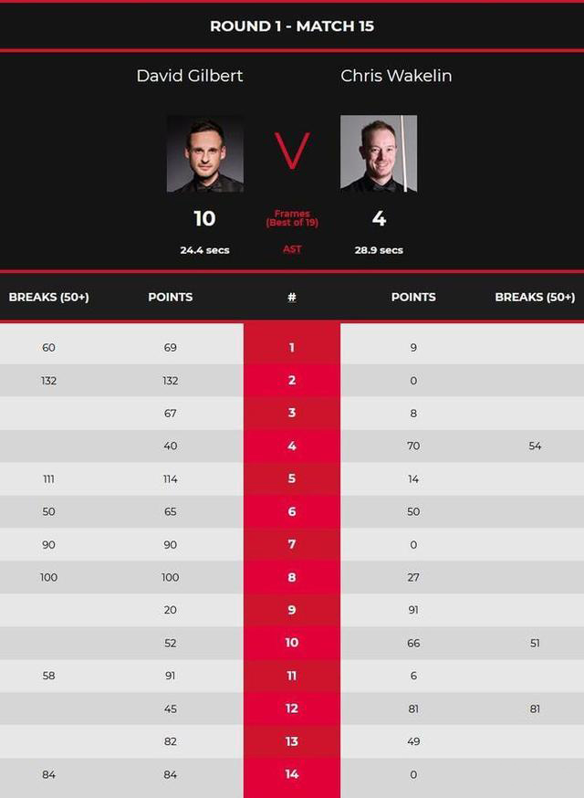 第10局,韦克林单杆51分,以66-52追回一局。第11局,大卫-吉尔伯特单杆58分,以91-6拿下。第12局,韦克林单杆81分,以81-45拿下。第13局,大卫-吉尔伯特82-49拿下,大比分9-4拿到赛点,双方也进入局间休息。休息归来,第14局,吉尔伯特再没给对手机会,凭借单杆84分一杆制胜,以84-0胜出,大比分10-4挺进第二轮。