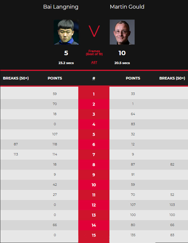 比赛一开始,白朗宁连赢两局2-0领先后,古尔德也做出了回应,同样是连赢两局,2-2战平,又来到了同一起点上。短暂休息之后,白朗宁多杆上后107-32再下一城,3-2再次领先。第六局白朗宁终于打出了单杆87分,单局总得分又破百拿下,4-2领先。第七局白朗宁单杆破百,建立5-2领先优势。