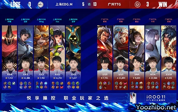 十分钟上海EDG.M先摸暗影暴君,清清项羽绕后配合 广州TTG丶帆帆 张飞喷大瞬间控制击杀孙尚香,上海EDGM玄影 曜在后侧收掉戈娅,一波一换二后广州TTG顺利控下暗影暴君;十二分钟曜脱节被打出掉点,广州TTG压下对面血线再控暗影主宰经济差来到4k;十六分钟广州TTG压进上高,不然镜开启大招瞬秒孙尚香,上海EDG.M缺少输出无力还手,广州TTG零封对手拿下最终胜利!