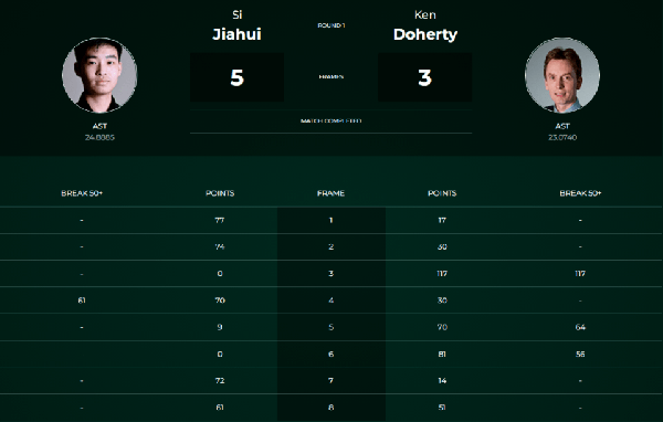 最终,斯佳辉以5–3的比分战胜了肯.达赫迪,晋级本届欧洲大师赛32强,他在1/16决赛的对手是凯伦.威尔逊和阿尔菲.伯顿这场比赛的胜者。