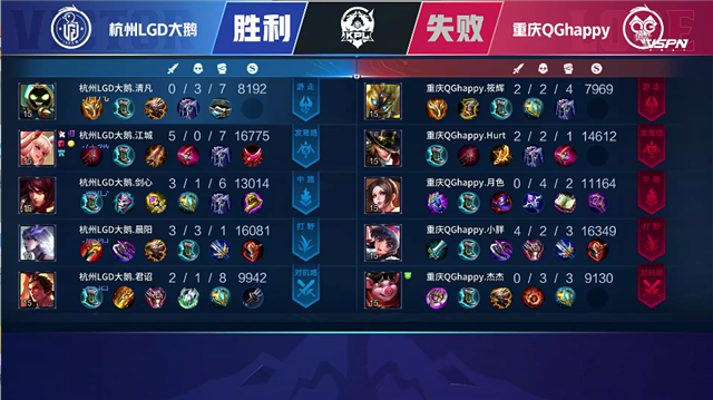 双方和平开局。2分08秒,杭州LGD拿下暴君,重庆QG拿下先知主宰。2分49秒,重庆QG鬼谷子击杀太乙真人拿下一血。4分09秒,重庆QG三人上路越塔击杀镜。6分09秒,杭州LGD中路击杀猪八戒并破掉重庆QG中一塔。9分13秒,野区团,双方1换1。10分42秒,重庆QG拿下主宰。12分35秒,重庆QG破掉杭州LGD上二塔。13分06秒,重庆QG控下黑暗暴君。14分17秒,杭州LGD公孙离极限反杀马可波罗,随后团战双方1换1。15分06秒,杭州LGD控下主宰。15分46秒,杭州LGD公孙离上路单杀不知火舞。16分04秒,杭州LGD破掉重庆QG上二塔,随后团战双方1换1。16分27秒,杭州LGD破掉重庆QG上高地,随后击杀鬼谷子。17分35秒,杭州LGD拿下黑暗暴君。18分钟,重庆QG不知火舞强切被击杀。19分37秒,双方团,杭州LGD打出2换3。20分13秒,杭州LGD团灭对手后摧毁重庆QG水晶先下一城。