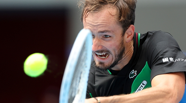 JRS直播网讯 10月2日,2023年中国网球公开赛男子单打1/4决赛在北京举行,俄罗斯选手梅德韦杰夫2比1战胜法国选手安贝尔,晋级半决赛。图为梅德韦杰夫在比赛中。