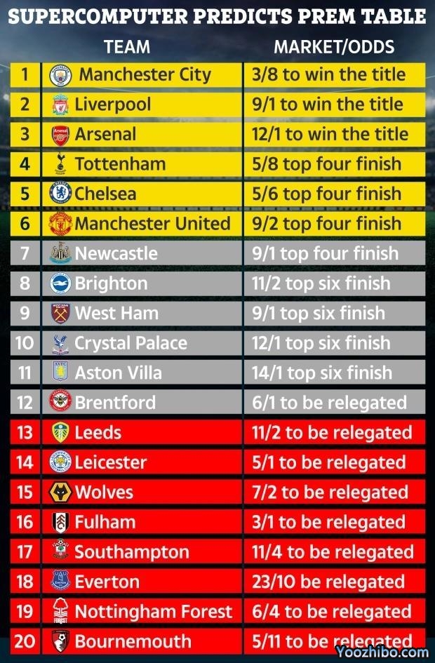 24直播网08月24日讯 据《太阳报》报道,超级计算机预测本赛季英超冠军将由曼城获得,利物浦、阿森纳和热刺则分别排名2-4位。